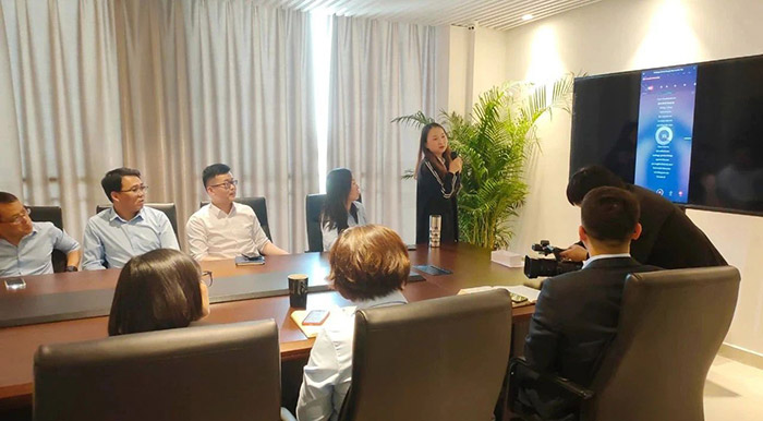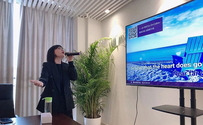 伴隨著現(xiàn)場緩緩奏起的輕音樂,主持人Sandy在進(jìn)行自我介紹和現(xiàn)場預(yù)熱后,以抽簽形式開始了歌曲競唱環(huán)節(jié),國際市場部的Sabrina自告奮勇獻(xiàn)唱曲,熱情演唱了經(jīng)典英文歌曲——《 Trouble is a friend 》,贏得現(xiàn)場陣陣掌聲!