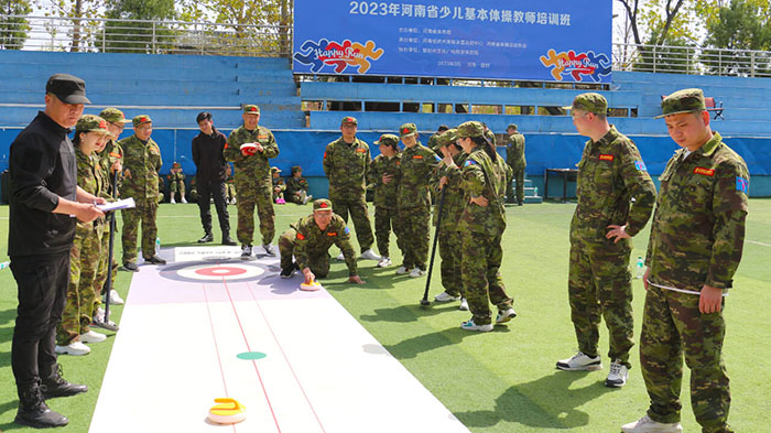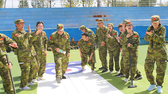 在【旱地冰壺】項(xiàng)目中,八個(gè)小組的隊(duì)員們一邊商榷對敵戰(zhàn)術(shù),一邊進(jìn)行任務(wù)分配。隨著一聲哨響,兩個(gè)賽隊(duì)同時(shí)開賽。隊(duì)員們?nèi)褙炞?、凝神靜氣,向前邁步?jīng)_刺,揮動手臂擲壺,冰壺按照隊(duì)員們設(shè)想的路線擊打到對方的冰壺,使其滑出得分圈并穩(wěn)穩(wěn)地停留在中心點(diǎn),成功得分,大家歡呼雀躍,圍觀隊(duì)員們也紛紛叫好,掌聲、歡呼聲此起彼伏,好不熱鬧。