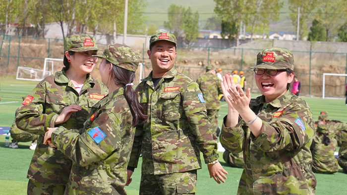 開訓(xùn)前,在破冰啟航環(huán)節(jié)——【智勇通關(guān)】項(xiàng)目中,每組選一個(gè)大魔王來防守別隊(duì),該隊(duì)隊(duì)員依次挑戰(zhàn)大魔王,石頭剪刀布定輸贏,贏了直接通過,輸了轉(zhuǎn)一圈,回來接著挑戰(zhàn),再輸即增加圈數(shù),直到全部隊(duì)員通過。大家把團(tuán)隊(duì)當(dāng)成了自己的“城堡”,在“對抗魔王”中,每個(gè)隊(duì)員都拼盡全力,期待被幸運(yùn)女神光顧,期待團(tuán)隊(duì)能盡早完成任務(wù),大家的歡笑聲、喝彩聲灑滿了訓(xùn)練場。
