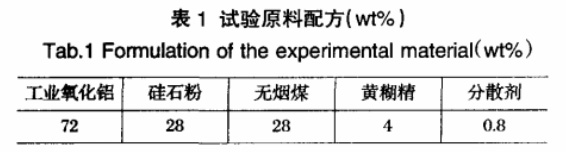 試驗以工業氧化鋁、硅石粉為主要原料,外加無煙煤,以黃糊精為結合劑,另外加少量分散劑。試驗基本配方如表1所示。其中工業氧化鋁的相組成為:70-80%為γ-Al2O3,5-10%為α-Al2O3,5-10%為三水鋁石。
