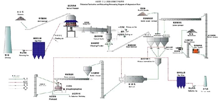 金屬鎂生產(chǎn)工藝流程-回轉(zhuǎn)窯煅燒白云石工藝流程:抓斗起重機將白云石送至皮帶輸送機,經(jīng)振動篩選出塊度合格的金屬鎂,由大傾角皮帶送到預熱器頂部料倉。料倉內(nèi)的白云石分別通過六個溜管進入預熱器,煅燒過程生產(chǎn)的約900℃熱煙氣與白云石再此換熱。白云石被預熱到800℃時由液壓推桿將石料推入回轉(zhuǎn)窯尾部煅燒。金屬鎂回轉(zhuǎn)窯的旋轉(zhuǎn)使石白云石均勻受熱,同時向窯頭方向逐步運動。窯頭罩處安裝有燒嘴,燃燒溫度達1250℃,以滿足活性煅白對溫度的需求。熾熱的煅白從窯頭落入冷卻器,與鼓風機鼓入的二次空氣換熱。空氣被預熱至約600℃進入窯頭助燃,煅白被冷卻到100℃以下,通過振動給料機均勻落至鱗板輸送機輸送至下道工序。離開預熱器約260℃的尾氣,通過管道進入袋式除塵器,對尾氣進行凈化,實現(xiàn)達標排放,完成整個煅燒金屬鎂工藝流程。